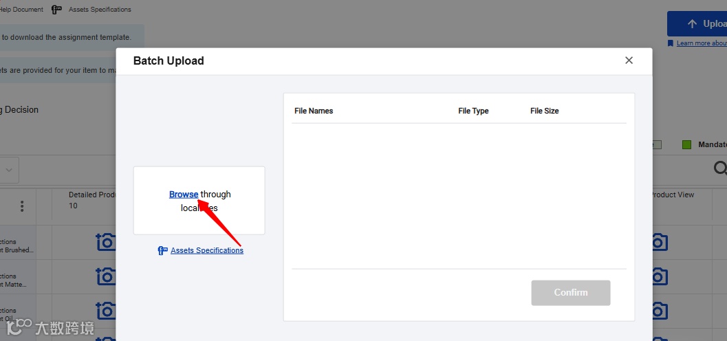*上传步骤:图片上传需点击Upload Assets,在弹出的Batch Upload界面中,点击Browse选择要上传的产品图片,然后点击Confirm进行上传。