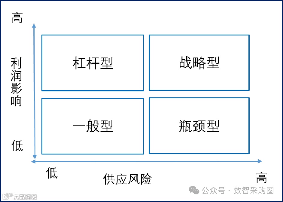 瓶颈型供应商(右下):采购额低,对企业的利润影响低,但供应风险高,通常是不可替代的、稀缺的产品或具有某种专利的产品、拥有某种特权的供应商。