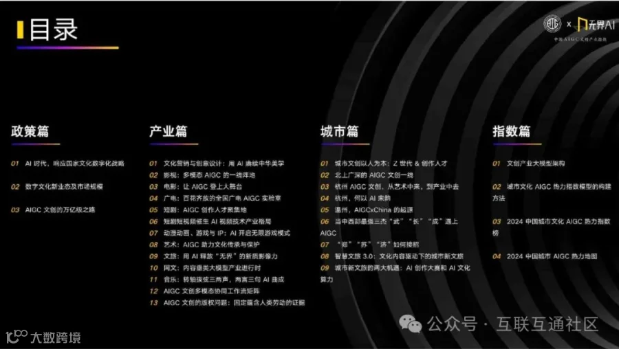 《产业指数》涵盖政策、产业、城市和指数四大核心篇章,全面剖析AIGC文创产业的发展现状与未来趋势[k]。