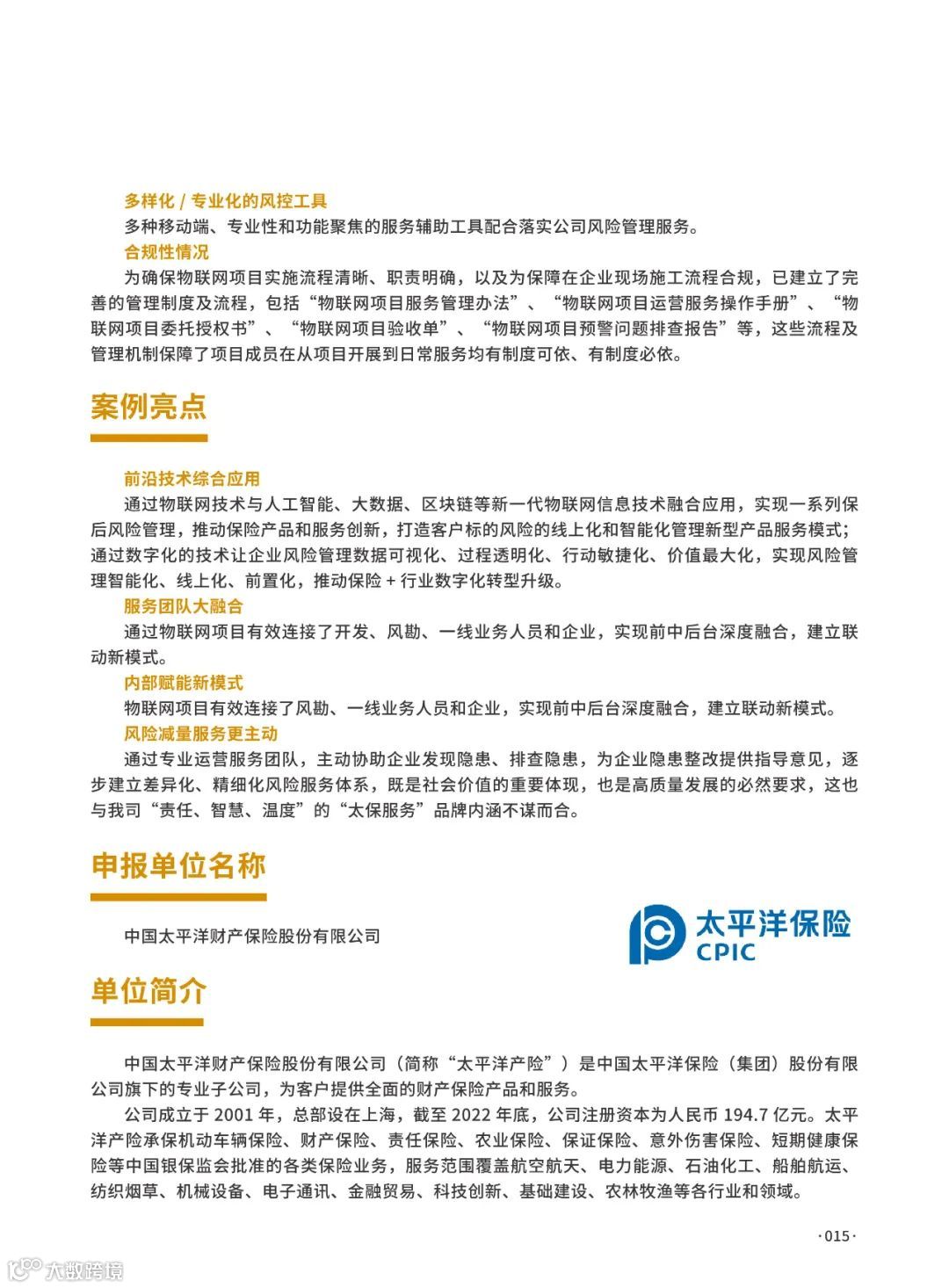 中国太平洋财产保险依托物联网、大数据与人工智能技术,构建产险AIOT风险减量解决方案,覆盖车险、企财险、农险等领域,推动保险服务智能化升级[k]。