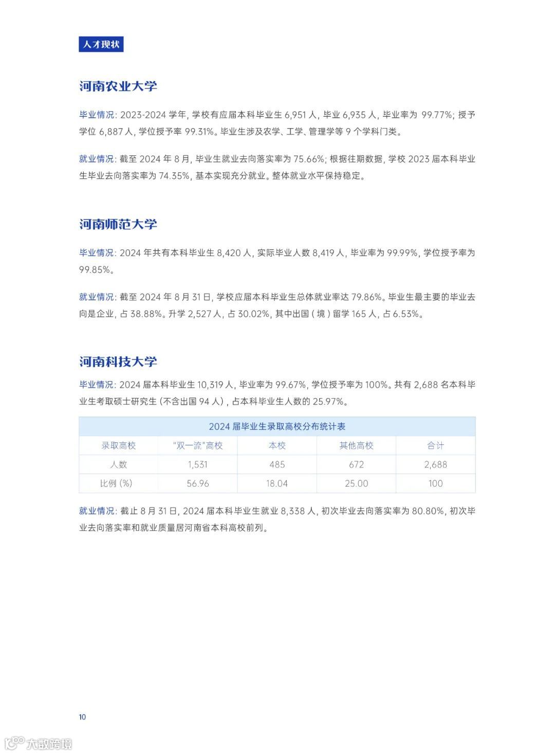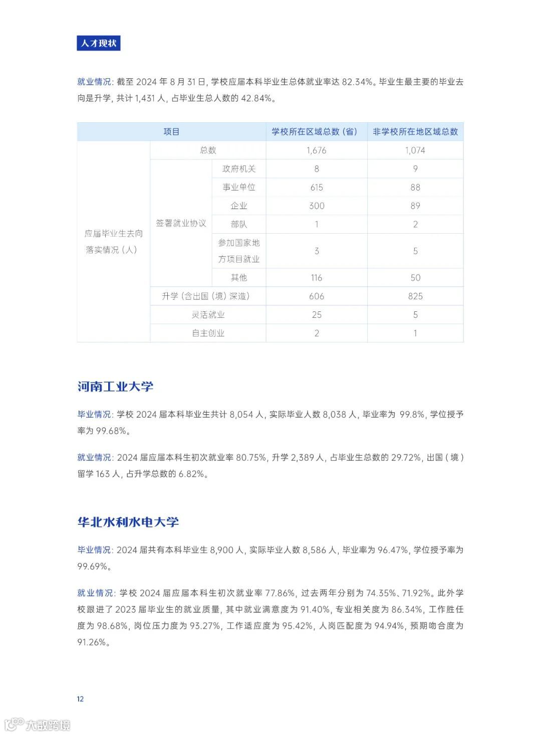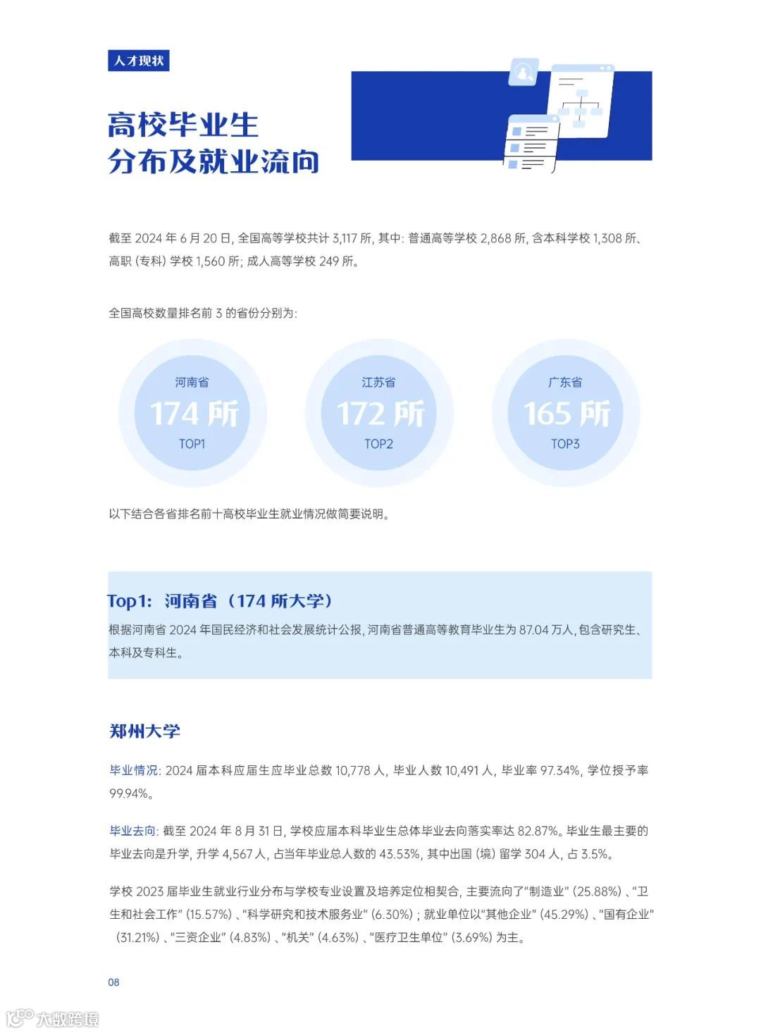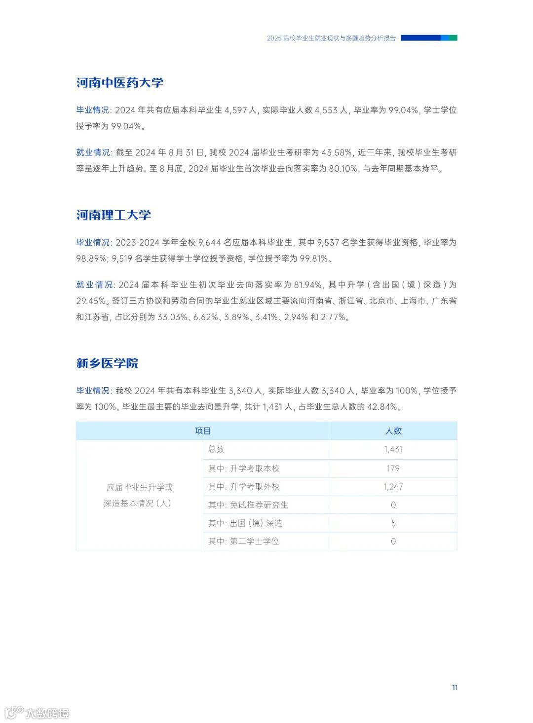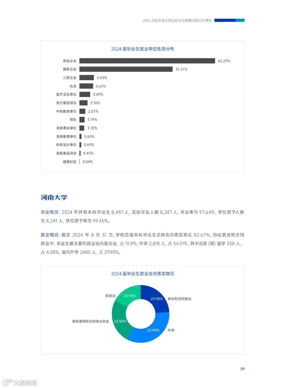 毕业生主要流向企业,升学与考公比例持续上升。郑州大学、南京大学等高校升学率较高。就业地域选择上,河南、江苏、广东等高校资源密集省份吸引力强,多数毕业生倾向留在本省或流向长三角、珠三角等经济发达地区[k]