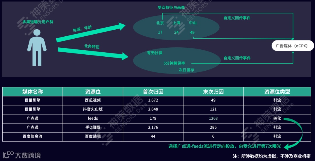 根据渠道特性定义引流与转化角色,制定差异化策略。将已转化用户特征通过API回传媒体,助力其定向更优受众[[k]]。