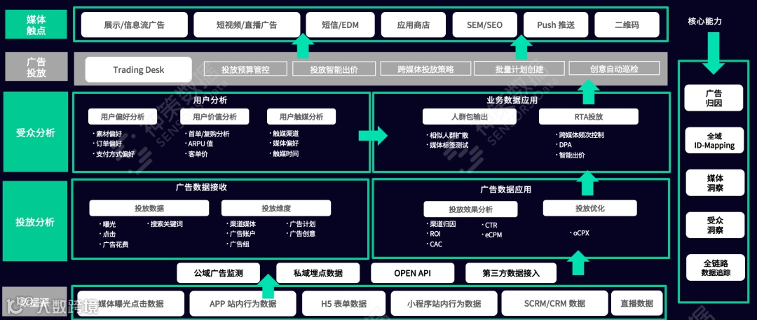 基于广告投放全景,神策总结出广告业务的五大核心能力:广告归因、全域 ID-Mapping、媒体洞察、受众洞察以及全链路数据追踪打通能力[[k]]。从效果广告视角出发,唯有融合底层归因、全域数据追踪与媒体受众洞察三大能力,方能实现高效投放与可持续获客增长[[k]]。