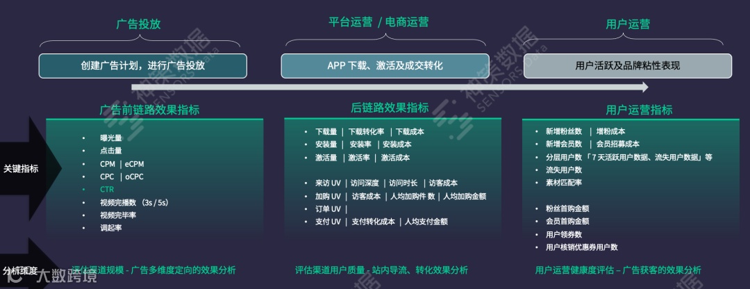 在广告业务流程中,通过整合各渠道可统计的数据并应用于投放优化,构成广告前链路数据分析的核心,常见指标包括点击率(CTR)、每千次展示成本(eCPM)、客户获取成本(CAC)及投资回报率(ROI)等[[k]]。
