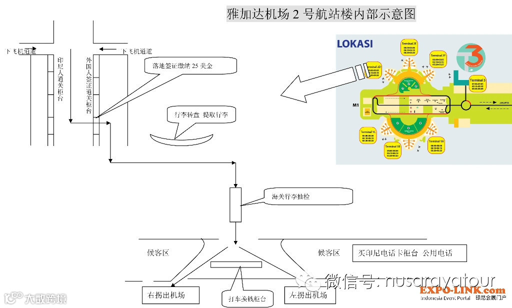 - 2号航站楼(Terminal 2):主要承担国际航班及印尼鹰航(Garuda Indonesia)运营的航班,具体分布为: