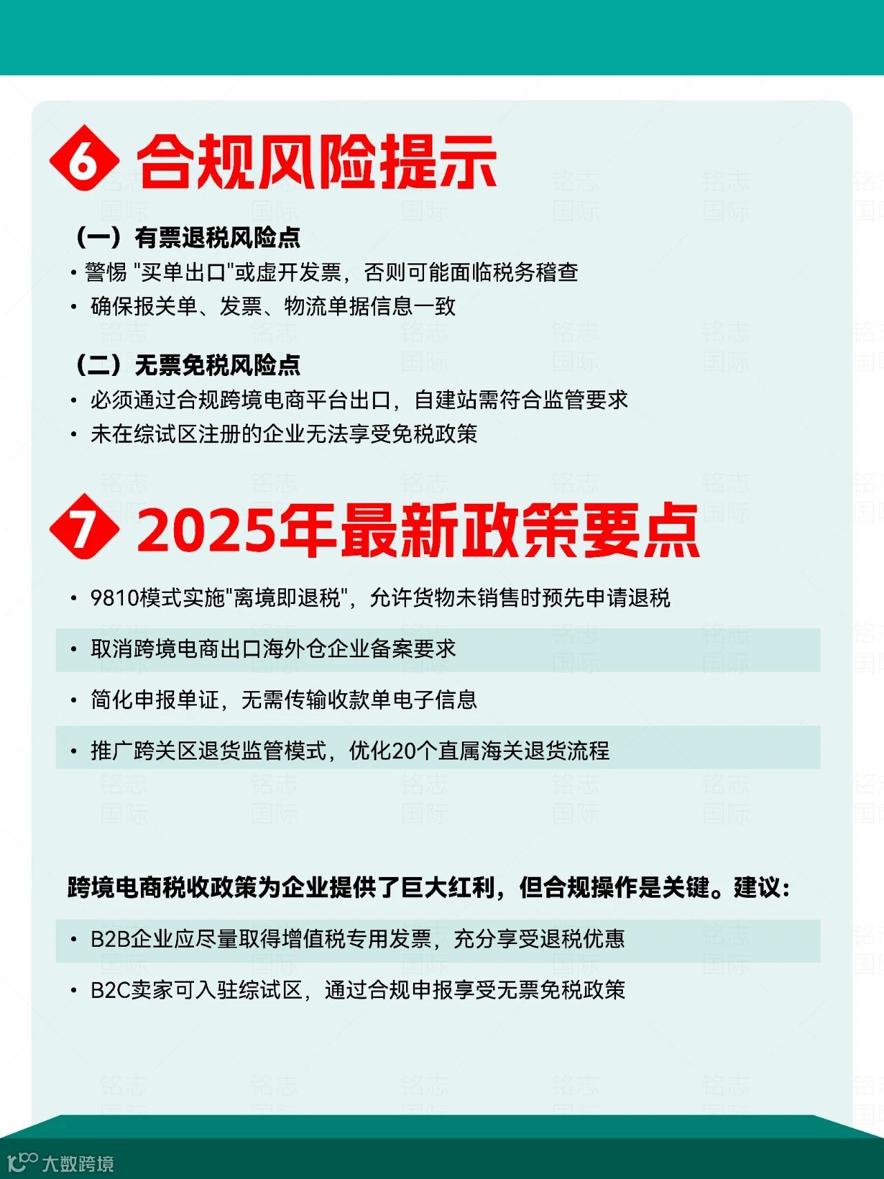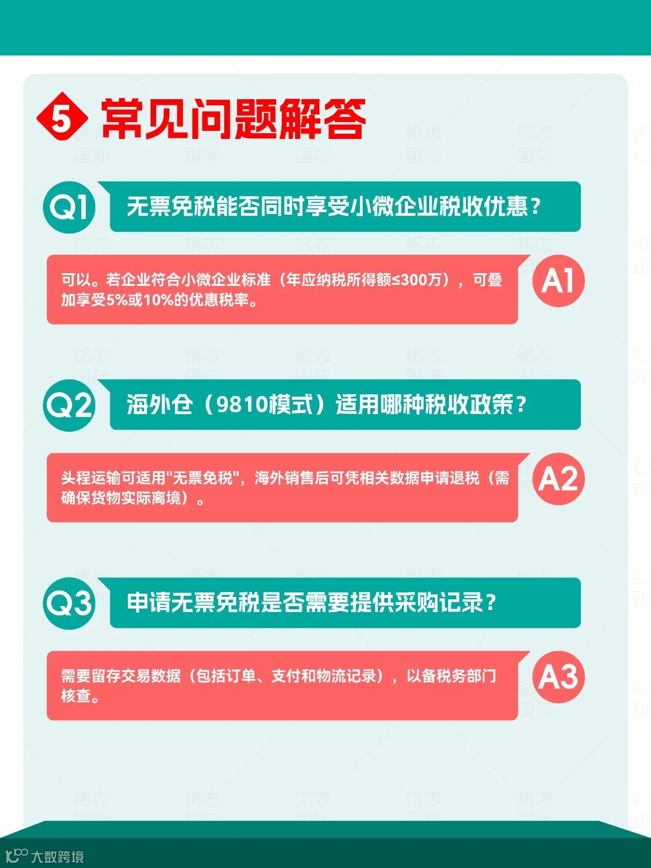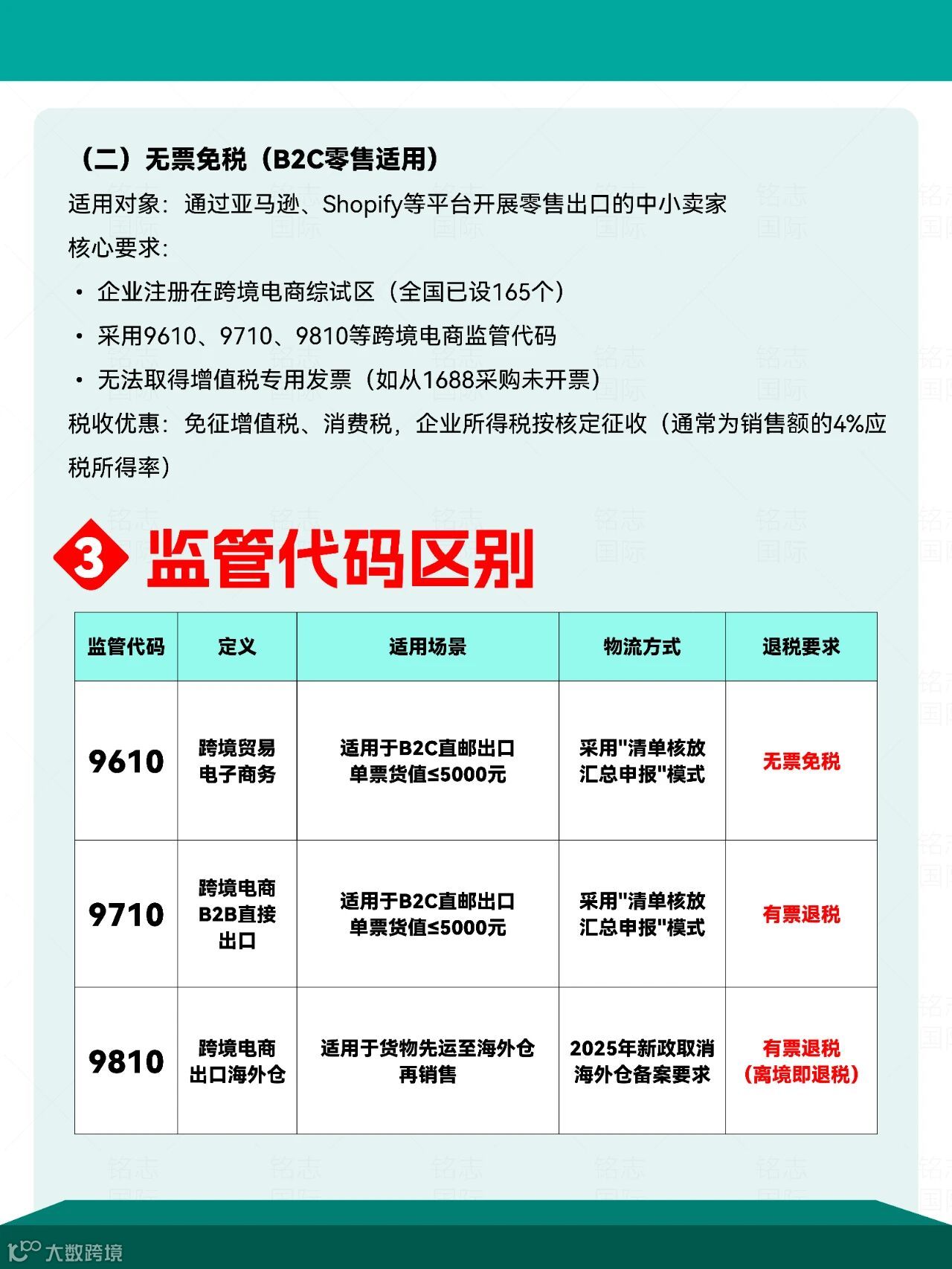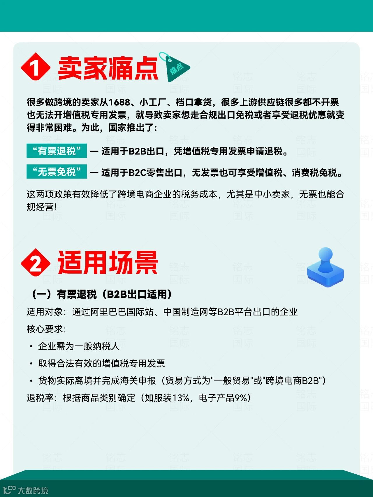 ✅ “无票免税”——适用于B2C零售出口,无发票也可享受增值税、消费税免税。这两项政策有效降低了跨境电商企业的税务成本,尤其是中小卖家,无票也能合规经营!