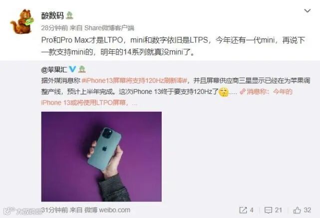 此消息引来了一加高管的注意,他点评到:iPhone 13Pro与iPhone 13 Pro Max才是LTPO屏幕,iPhone 13、iPhone 13mini依旧是LTPS屏幕,今年还有一代迷你版,再说下一款支持mini的,明年14系列就真没mini了。