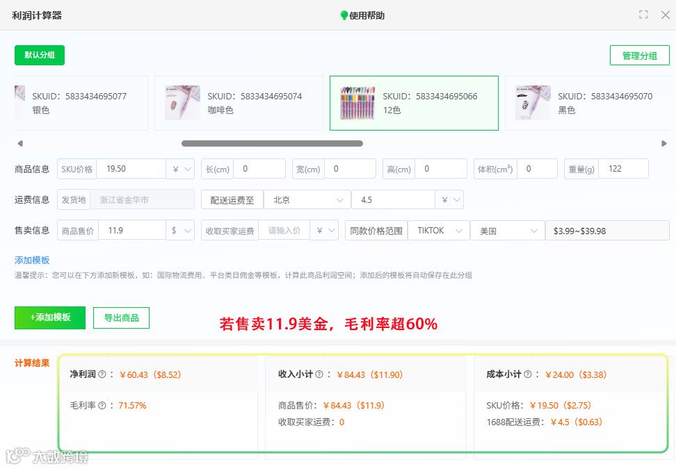 通过店雷达选品工具检索1688站内同款商品,可以看到这类产品单只笔只需1-2元左右,套装在20元左右,若售价11.9美金,利用利润计算器进行核算,可以初步算出毛利率在71.57%,利润较为可观。