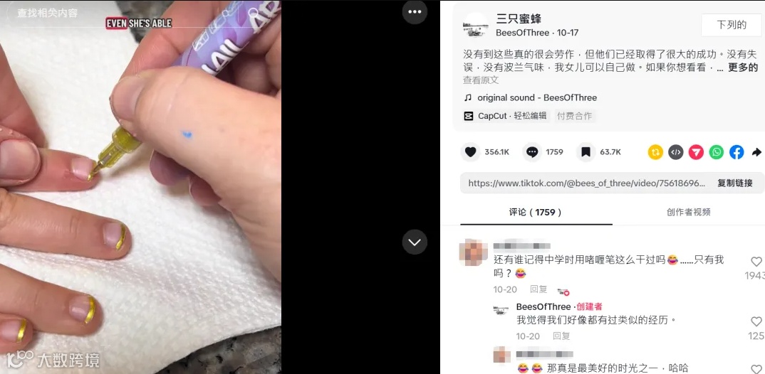 其中一个合作达人发布“用金色马克笔为女儿做美甲”视频,获得1250万次播放,引发用户自发晒出DIY作品,如小花、卡通形象、几何图案等,形成社交裂变效应。
