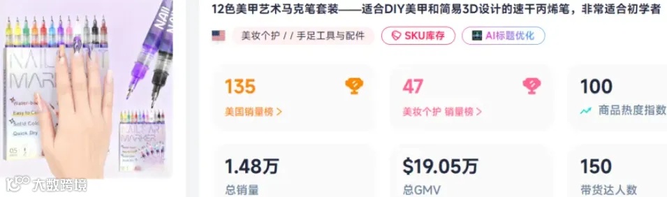 据调查,国内同款12支装美甲笔批发价仅为14–16元人民币,通过信息差以11.99美元(约85.22元人民币)销往美国,利润空间巨大。