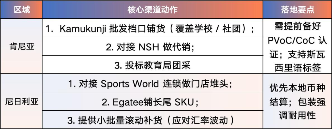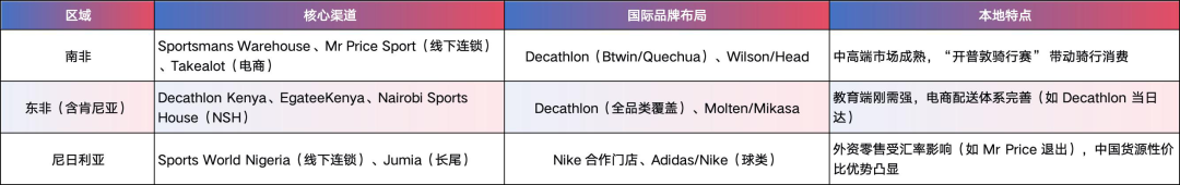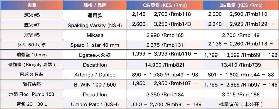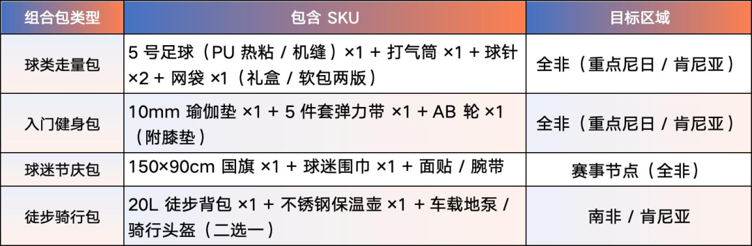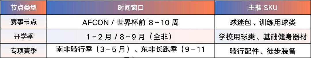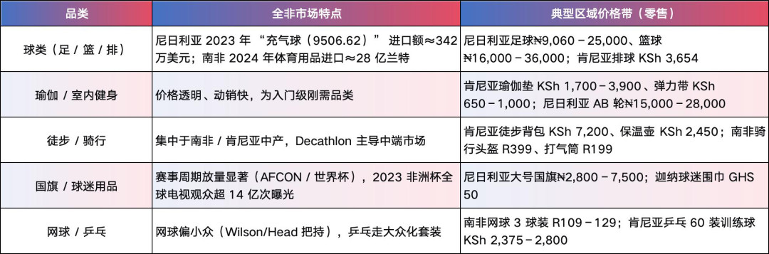 细分赛道亮点:球类(足球/篮球/排球)+球迷周边(赛事驱动)、入门瑜伽 &室内健身小器材(尼日利亚/肯尼亚走量快)、骑行&徒步(南非/肯尼亚中产偏好)为三大核心增量品类,赛道长期景气度确定。