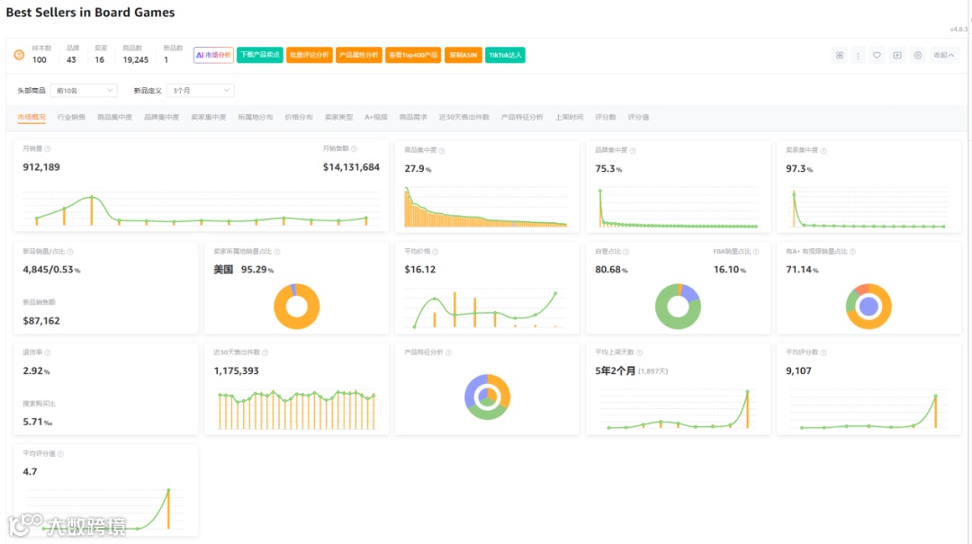 市场集中度较高,样本数据显示:新品占比0.53%,商品集中率27.9%,品牌集中度75.3%,卖家集中度97.3%,美国卖家占比高达95.29%,类目退货率为2.92%。表明市场由少数成熟卖家主导,新进入者面临较大竞争压力。