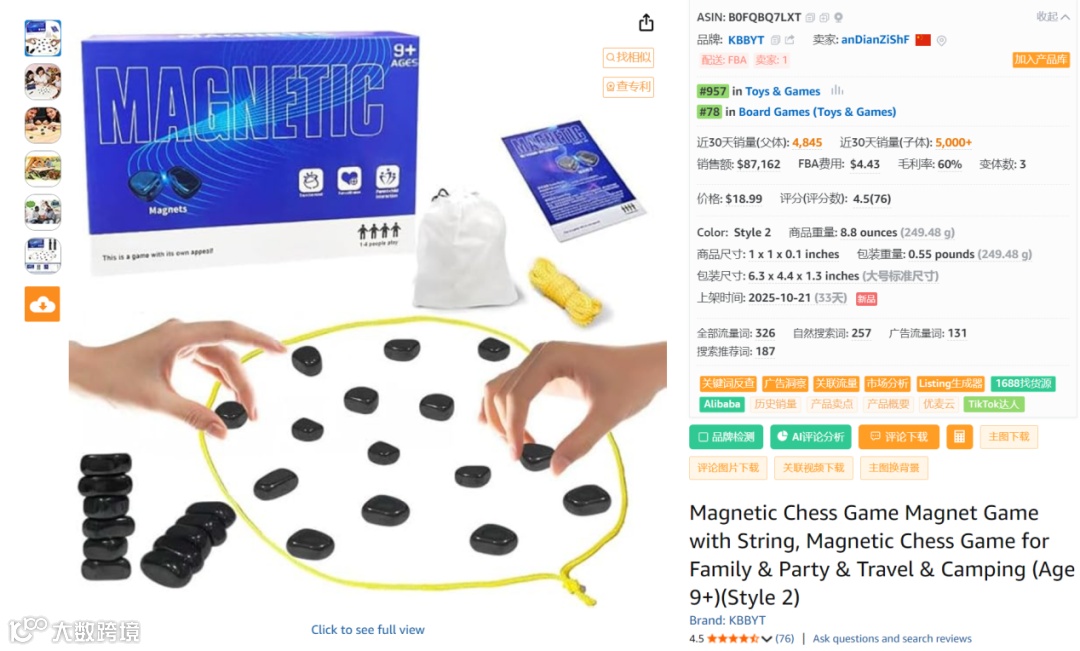 今天分享一款在社交媒体上走红的亲子类磁性棋子游戏套装,结合市场数据进行分析。