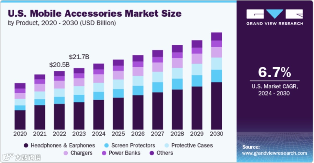 无线配件正成为消费电子领域的“增量战场”。据Grandview Research数据,2024年美国无线配件市场规模达232.2亿美元,预计2030年将突破342亿美元,年均复合增长率6.7%,在存量博弈的电子市场中保持稳健上升。