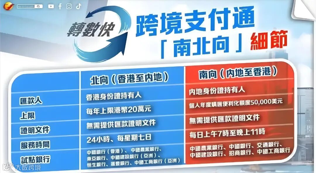 - 北向(香港→内地):每人每年20万港币额度,单日限额1万港币;服务时间为每周7天、全天24小时。