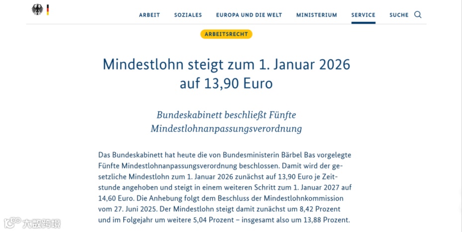 近期,德国联邦内阁正式通过法定最低工资调整协议:2026年1月1日起,德国最低工资提升至13.90欧元/小时;2027年1月1日起,提升至14.60欧元/小时。
