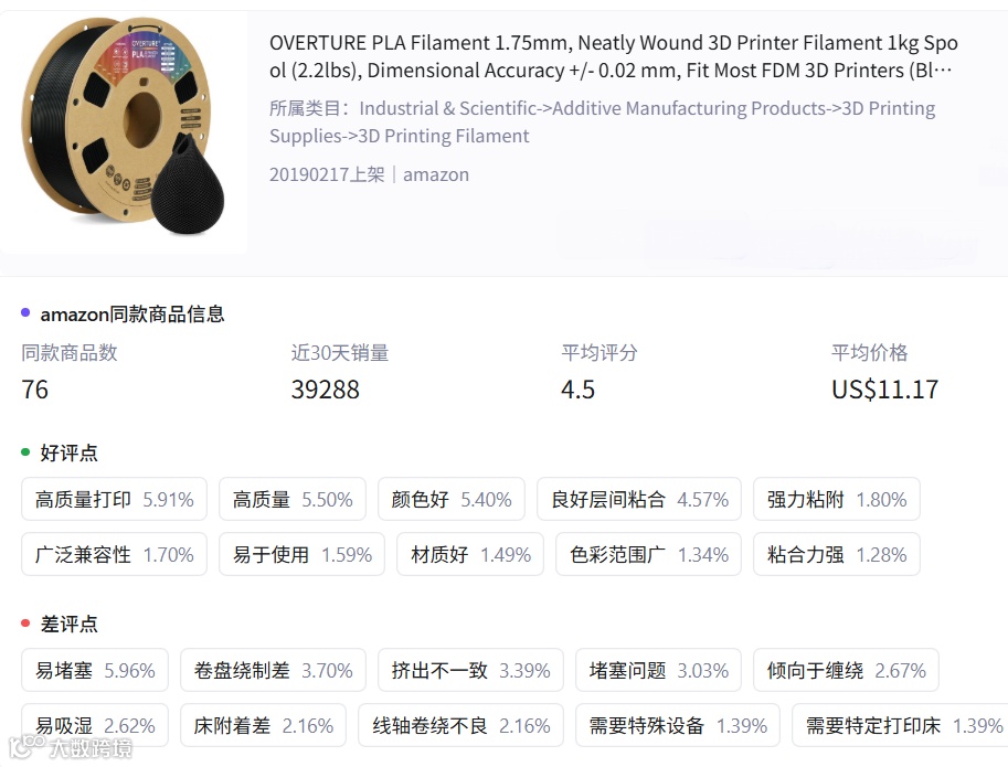 通过对美国亚马逊平台3D打印耗材的销量数据进行分析,我们识别出市场主导品牌和热销产品。