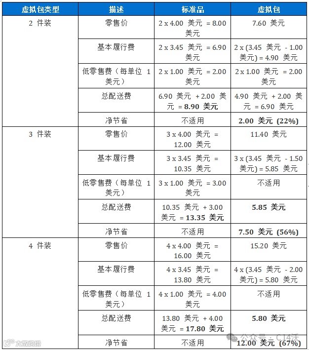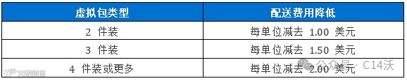 以单价4美元、运输重量1磅的商品为例,虚拟包享受5%折扣。下表展示标准销售与虚拟包在配送费用及低零售附加费方面的差异[k]。