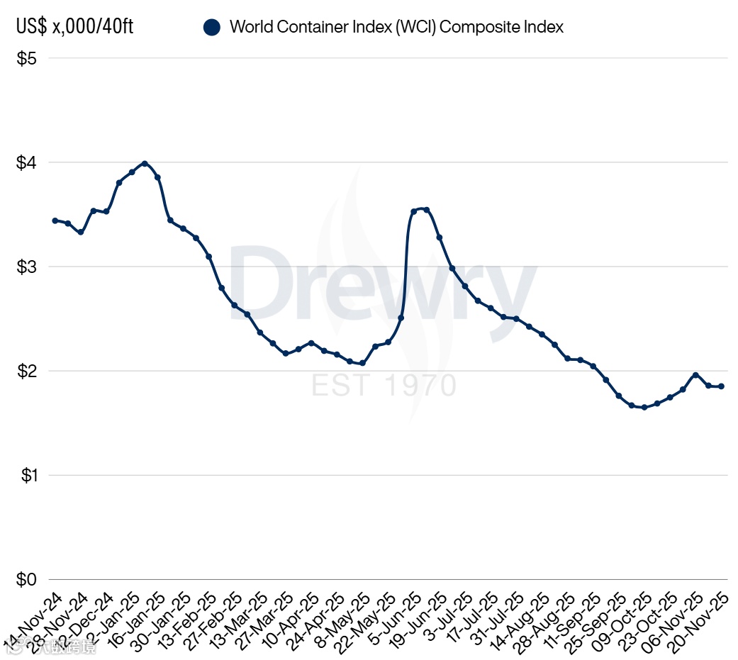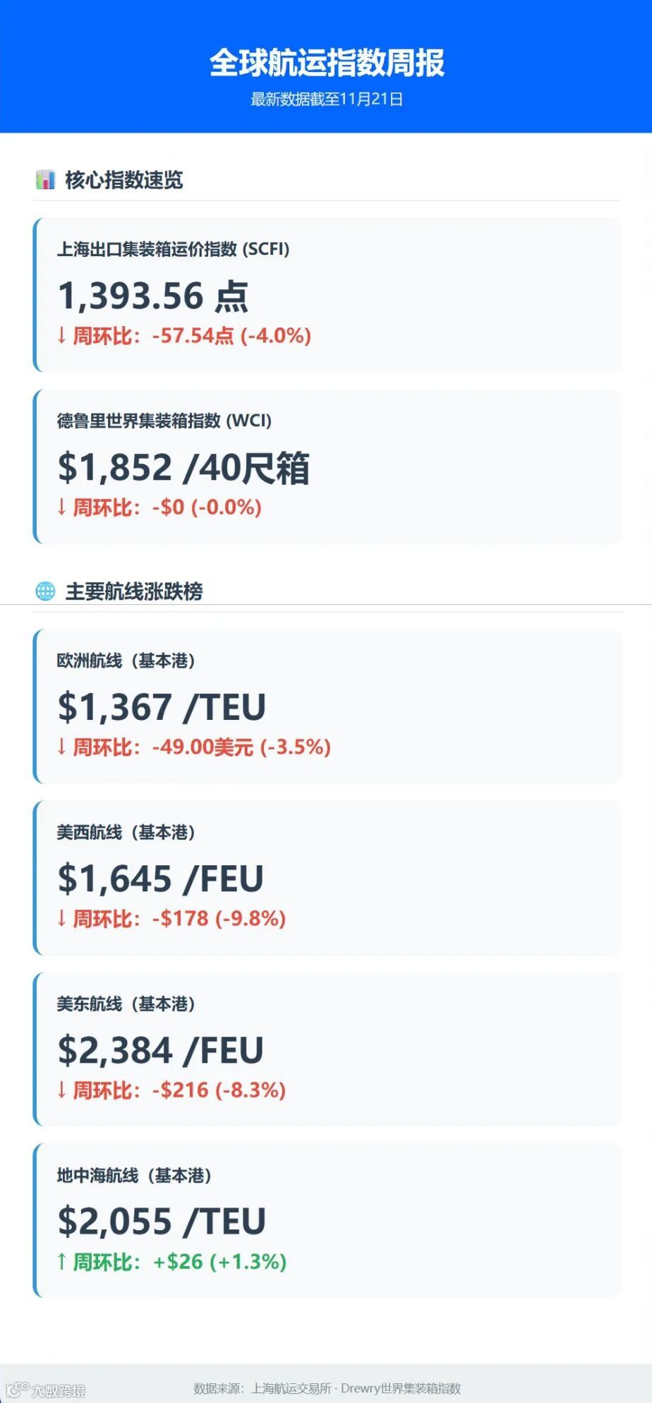 截至11月21日,上海出口集装箱综合运价指数(SCFI)为1393.56点,较上期下跌约4.0%。