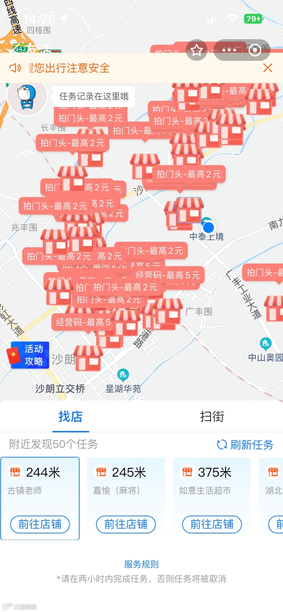 这个就是赚小钱的兼职,一单2-10元之间,每个人都可以做,点开始任务就会显示你附近的店铺任务,直接接就行,一天赚个四五十,水电费就到手了。