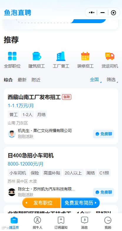 这是一个线上招聘的微信小程序,有兼职和全职工作,但全职工作推荐的比较多,比如建筑招工、工厂招工、装修招工、货运司机等。