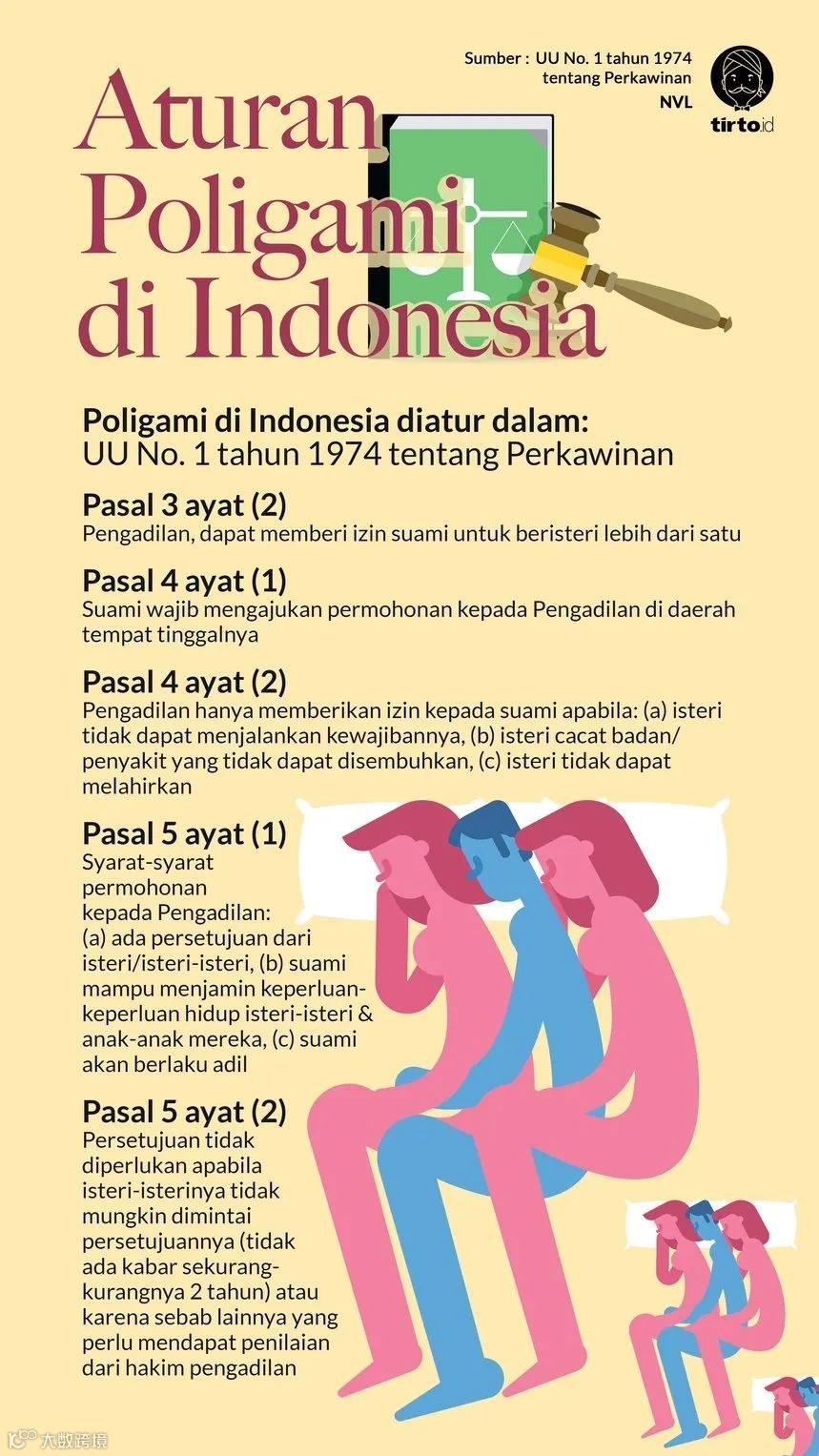 在印尼,一夫多妻制是长期存在的社会争议话题。根据伊斯兰教义,男性最多可娶四位妻子,但《古兰经》强调必须公平对待所有妻子,而“公平”被认为难以衡量与实现,因此反对者认为不应实行此制度[k]。另有观点指出,一夫多妻制源于早期父权社会,随着社会发展已无延续必要[k]。