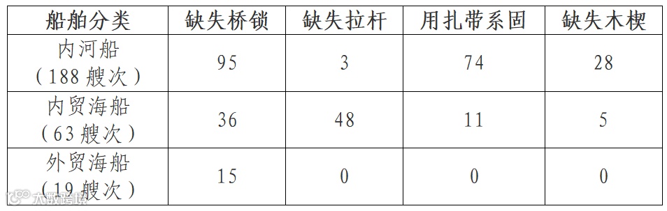 以在长江镇江段尹公洲水域营运作业的集装箱船舶为例,海事人员重点检查其集装箱系固绑扎的执行情况、系固绑扎的规范性、《集装箱系固手册》的配备与符合性,共抽查集装箱船舶270艘次,受检船舶涵盖了常见的集装箱船型。