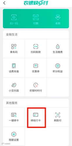 2 进入“农银快e付”页面点击“绑他行卡”。