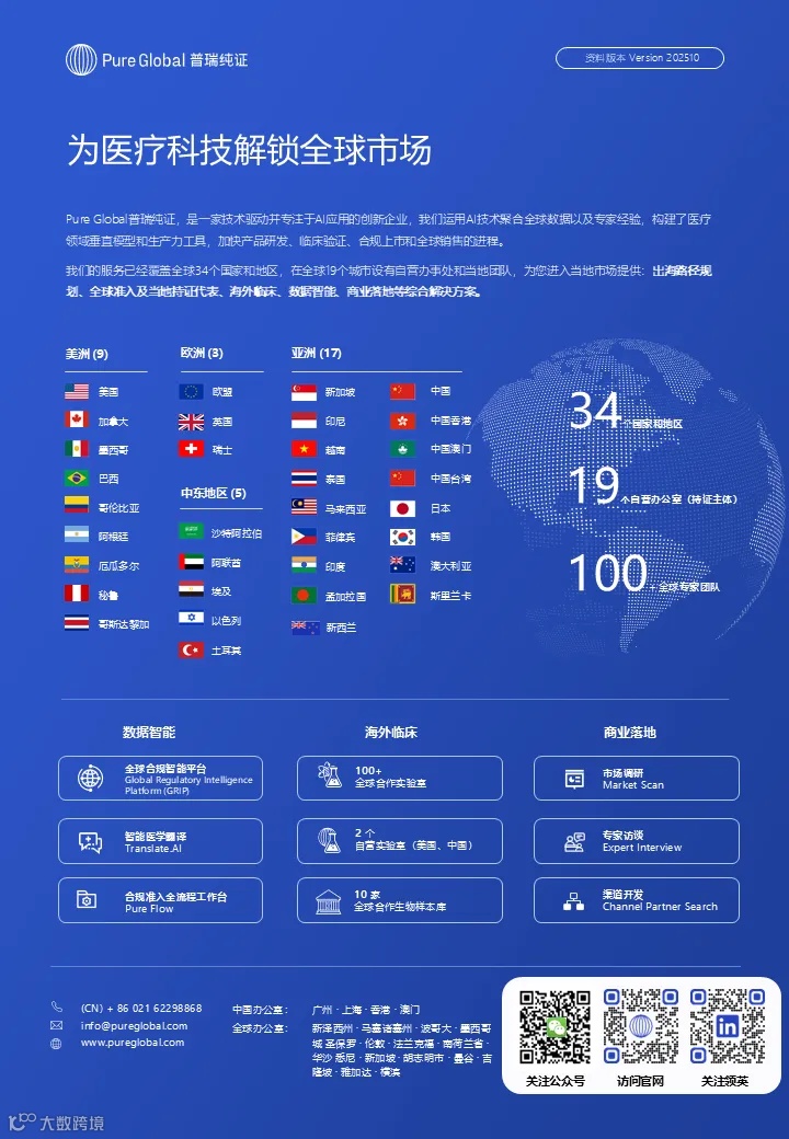 普瑞纯证拥有全球法规专家团队,支持34个国家/地区注册准入服务,并配备当地代表及全球数百个合作临床实验室与专家团队。依托两个自营实验室和八个海外生物银行,为企业提供高效临床试验服务。其全球智能法规平台(GRIP)整合全球法规资讯、临床数据、注册产品与经销商数据库,助力企业制定海外市场战略。通过AI Agent与本地化网络,普瑞纯证推动中国医械企业从“寻宝式”出海向“融入共赢式”转变,全面加速全球化进程。