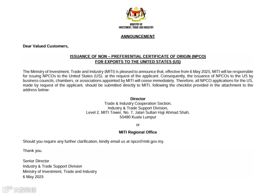 受美国关税风波的影响,不少企业意图借助马来西亚渠道向美国市场转运货物、贴上“马来西亚制造”以逃避高额关税。因此,MITI宣布自2025年5月6日起,对美国出口产品的马来西亚非优惠原产地证将由MITI签发,其他商会、协会无法签发,旨在提高出口原产地证书的权威性,打击虚假申报。