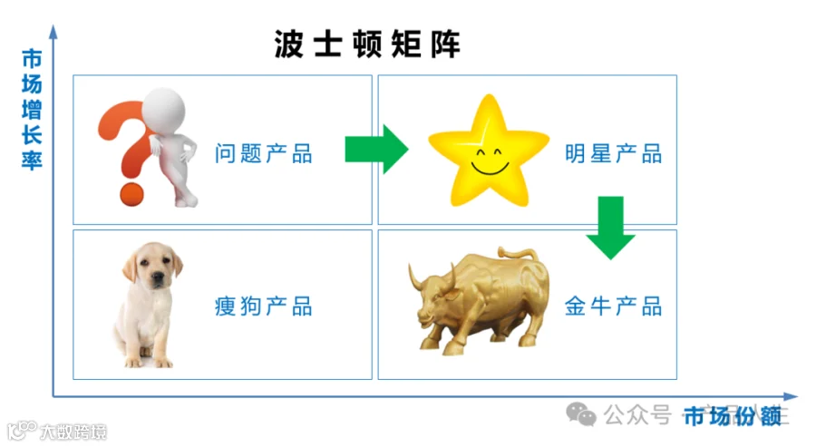 波士顿矩阵,根据市场增长率和市场份额两个维度,将产品分为四种类型:明星产品、金牛产品、问题产品和痩狗产品。