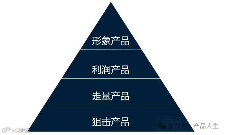 产品结构金字塔,将产品划分成四个层次:形象产品、利润产品、走量产品和狙击产品。