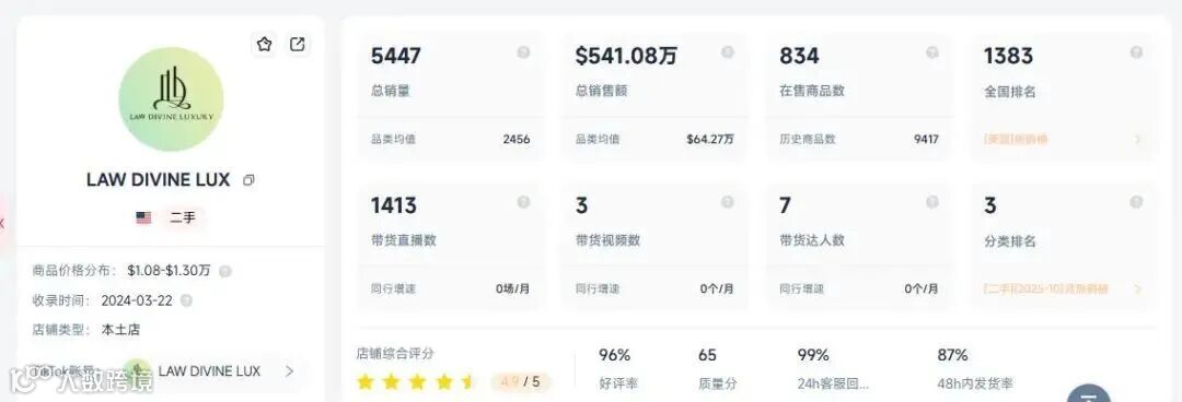 另一家名为 LAW DIVINE LUX 的二手店铺表现同样亮眼,其总销量已达 5447 件,总销售额突破 541.08 万美元(约人民币 3832 万元),其中 97.6% 的成交来自商品卡,仅凭商品详情页就能实现转化。