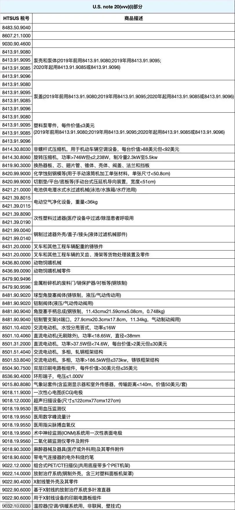 所涉及的税号产品依据 HTSUS 税目 9903.88.69 以及美国注释 U.S. notes 20(vvv)(i)、20(vvv)(ii)、20(vvv)(iii)和20(vvv)(iv)来界定。这些豁免产品种类丰富,包含儿童用品、泵类部件、化工材料、电子元件以及医疗用品等。