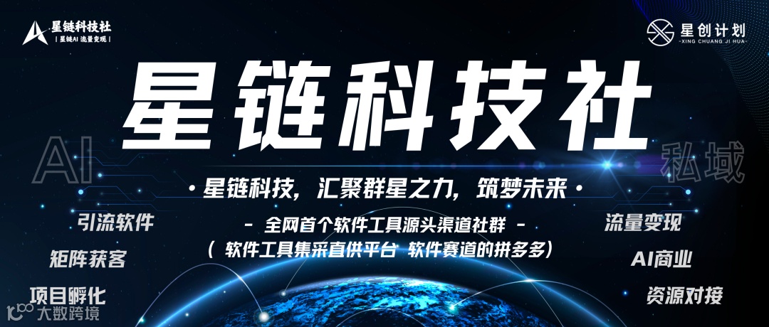 星链科技社是全网首个软件工具源头渠道社群,软件工具集采直供平台,软件赛道的拼多多。专注汇聚全球前沿软件、高效工具与实战资源!为私域创业者及企业商家提供前沿、高效、实用的软件工具与解决方案!赋能引流、转化、运营、管理等全链路。直连一手技术资源,成本直降50%+!以“技术赋能商业,AI连接未来”为使命,构建一个集资源、知识、实战于一体的高价值生态平台。
