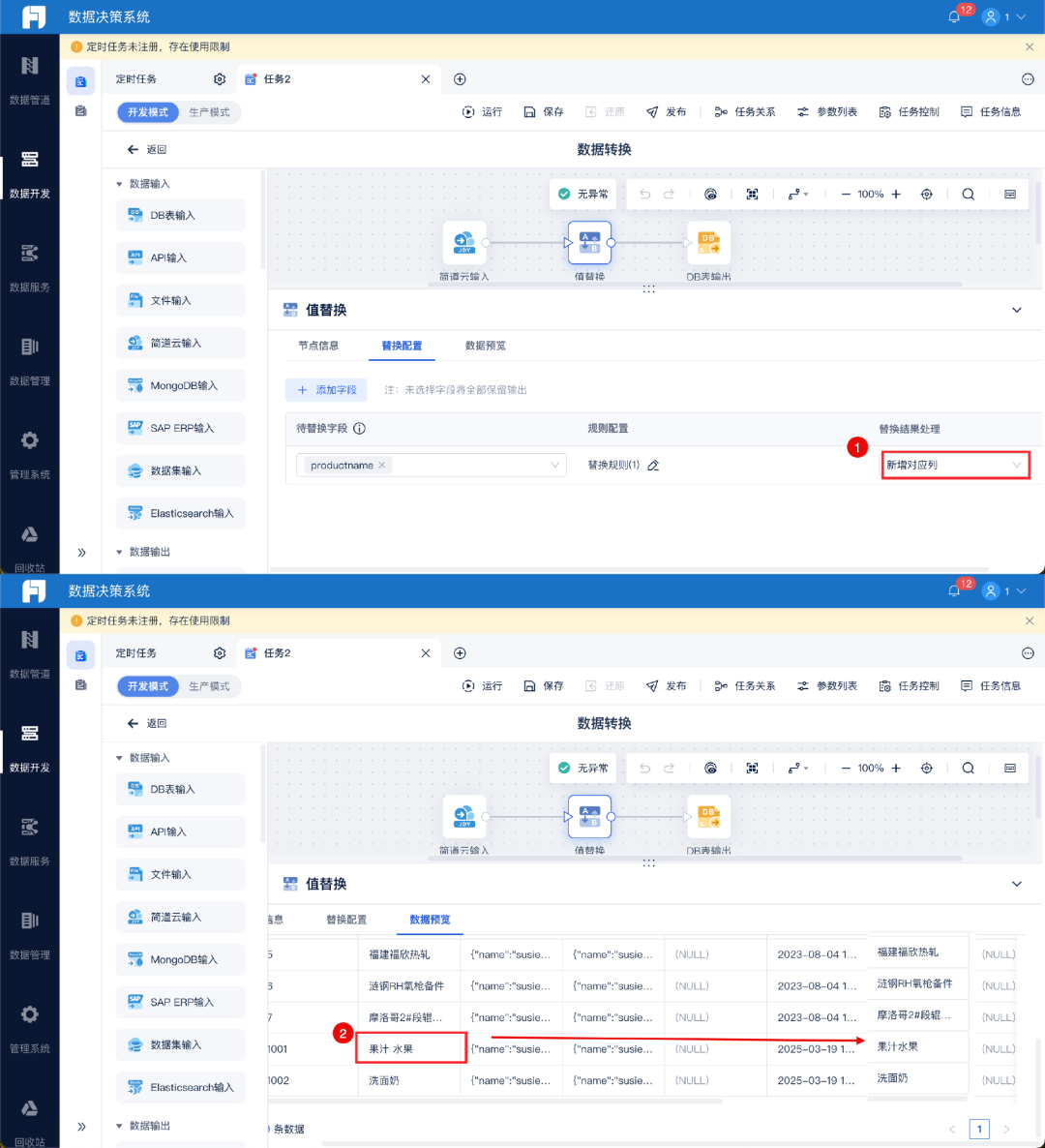 针对日期、手机号、金额等格式混乱的问题,手动修改费时费力,一定要用工具批量处理。FineDataLink里有现成的“格式转换”组件,比如把“24/05/20”转换成“2024-05-20”,把“138-xxxx-1234”转换成“138xxxx1234”,把“500元”转换成“500.00”,选中需要转换的字段,一键就能批量完成。