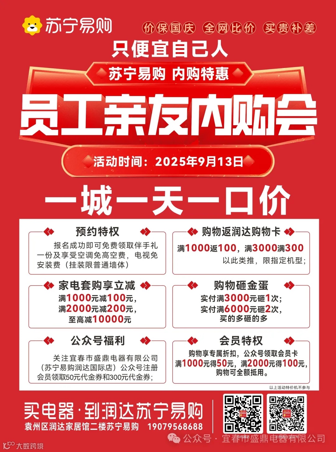 关注宜春市盛鼎电器有限公司(苏宁易购润达国际店)公众号注册会员领取代金券,购家电直接抵扣。