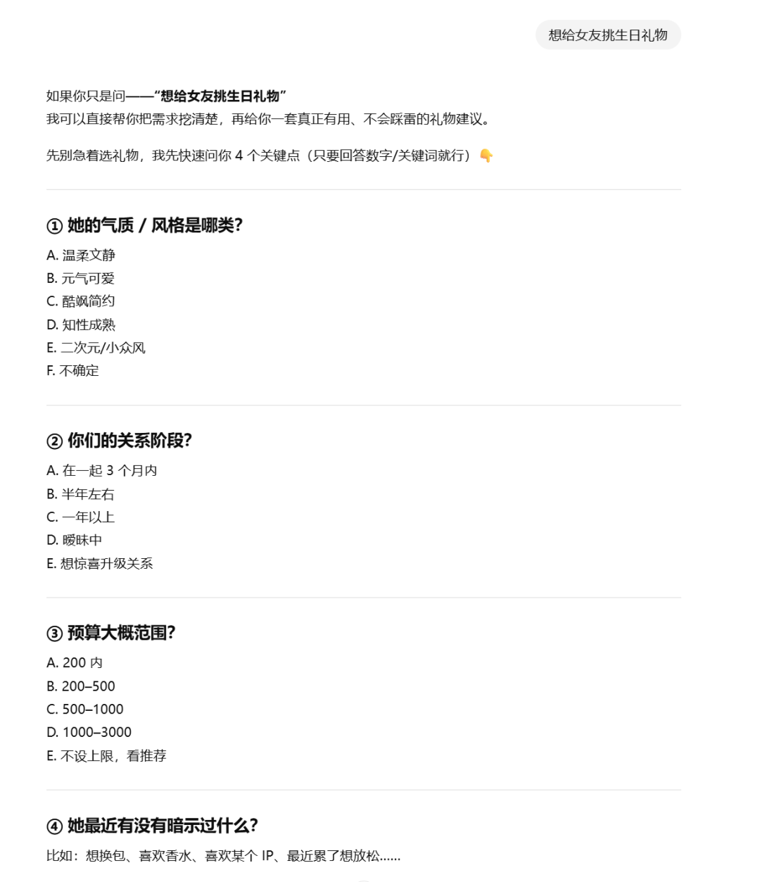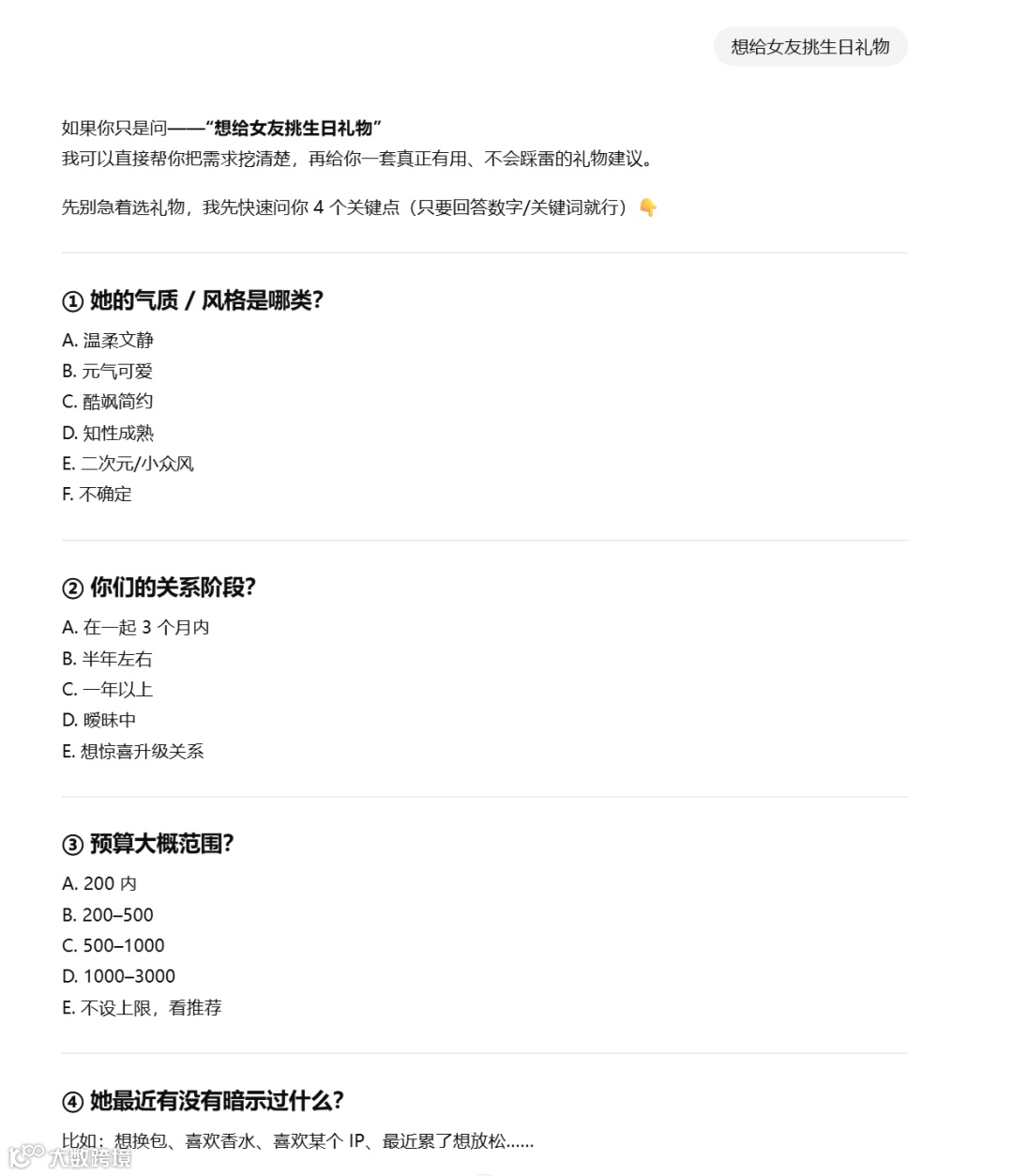 例如,当你只说一句“想给女友挑生日礼物”,ChatGPT 并不会给出泛泛的商品列表,而是会先把消费者真实的决策问题“问出来”:喜欢什么风格、预算多少、送礼场景是什么……