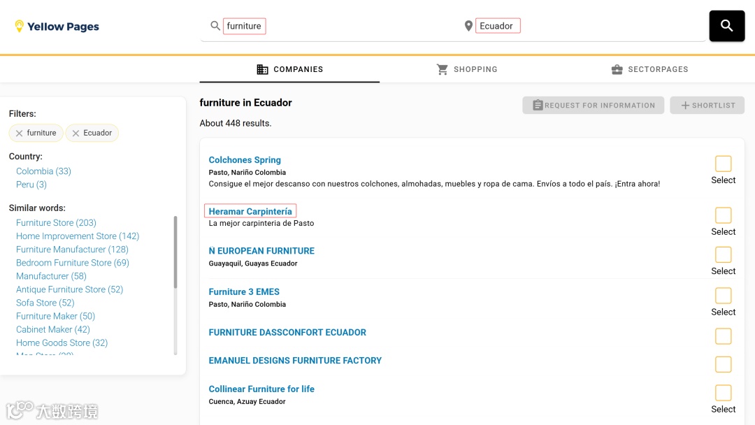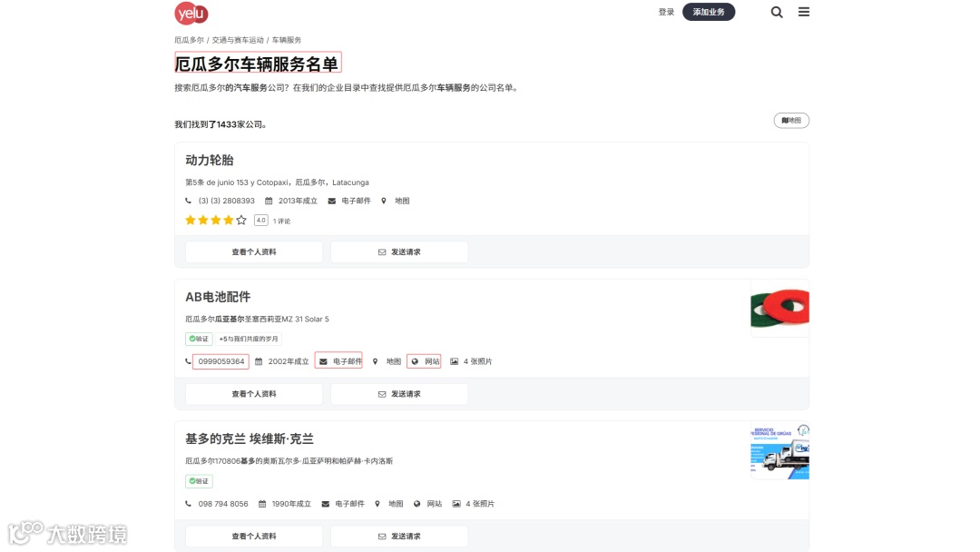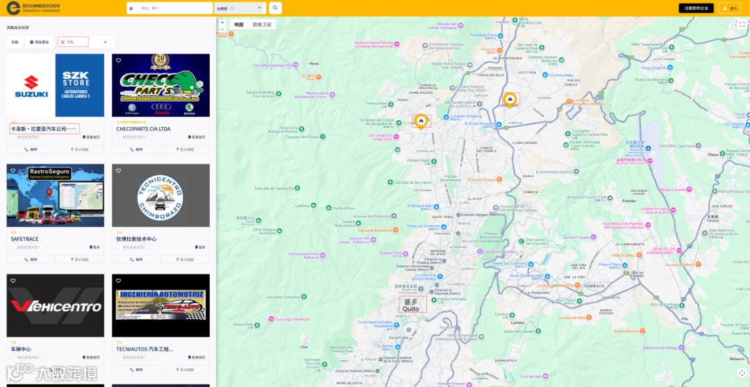 厄瓜多尔商业目录网站,支持地图定位企业位置,覆盖汽车、家具装饰、机械等多个行业。