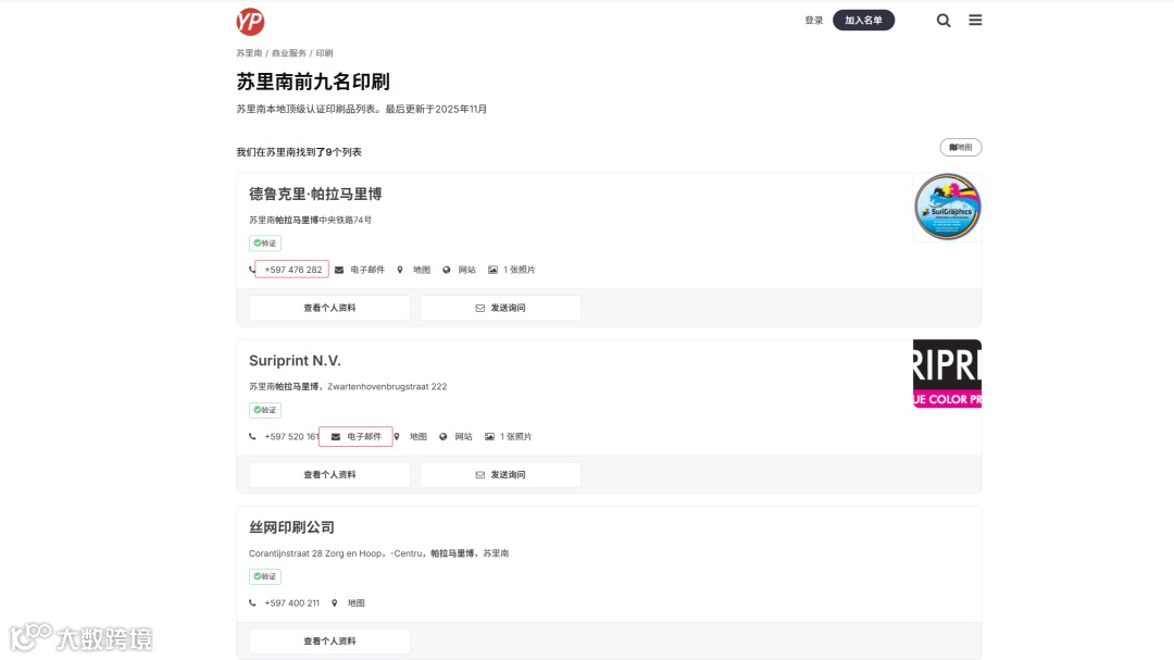 苏里南在线商业数据库,收录本地商家信息,包括名称、邮箱、地址、电话和 WhatsApp 等联系方式。