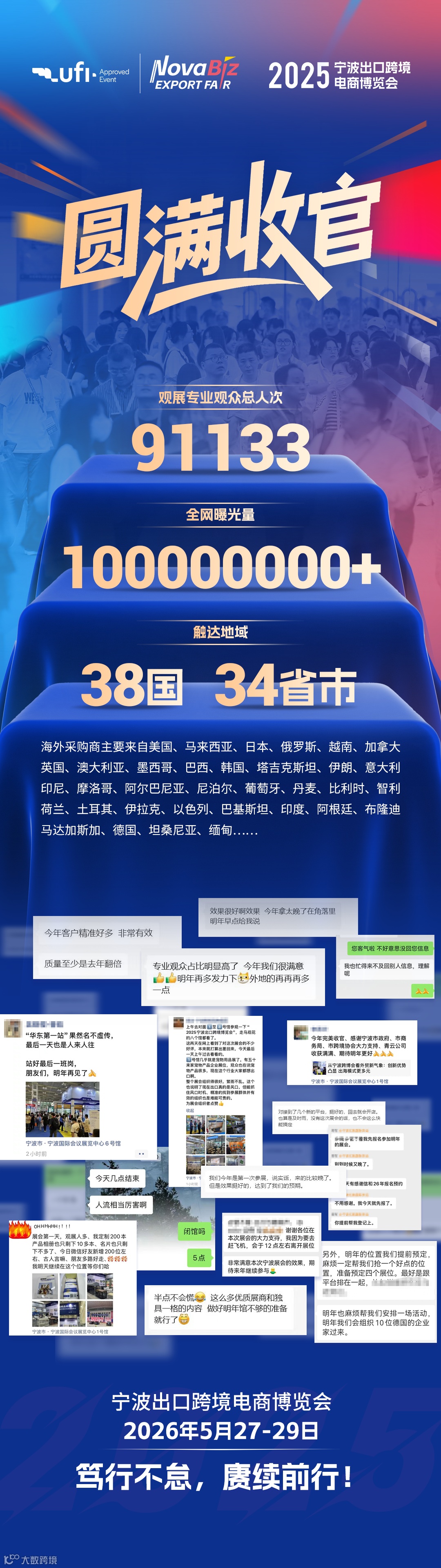 2025宁波出口跨境电商博览会(简称“2025宁波跨博会”)于5月28日至30日在宁波国际会展中心成功举办。本届展会展览面积达7万平方米,汇聚2500家优质外贸工厂、36家跨境电商平台及190家服务企业,吸引专业观众91,133人次到场参观采购[k]。