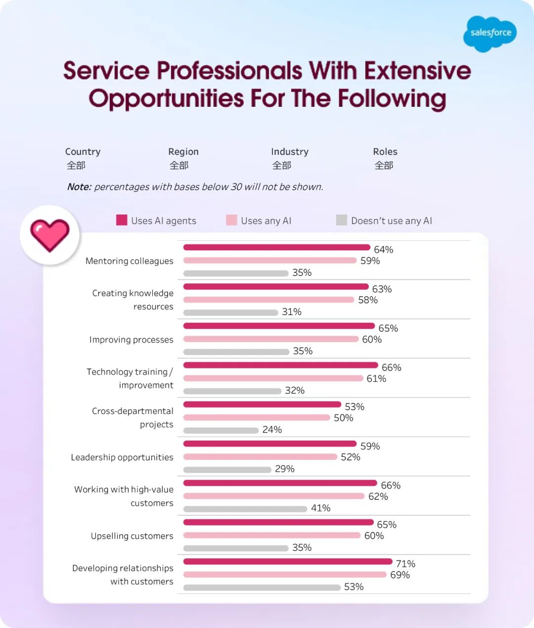 事实上,71%配备AI的服务代表表示,AI正在为他们创造发展机遇。具体表现在:86%的服务人员已通过使用 AI 工具培养了新技能,81%的人表示使用AI工具使其岗位职责变得更加专业化。最重要的是,使用AI的服务人员对其职业发展充满信心,其中使用AI代理的人员对职业前景的乐观程度最高。这一现象或许反映了前瞻性技术先行者存在的选择性偏差,但恰好与他们反馈的技能培养、岗位专业化、获得领导力机遇相契合。