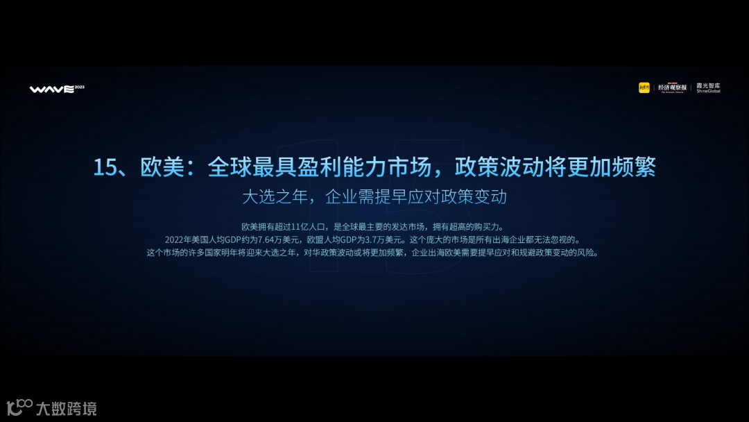 但是这个市场的许多国家明年将迎来大选之年,对华政策波动或将更加频繁,企业出海欧美需要提早应对和规避政策变动的风险。