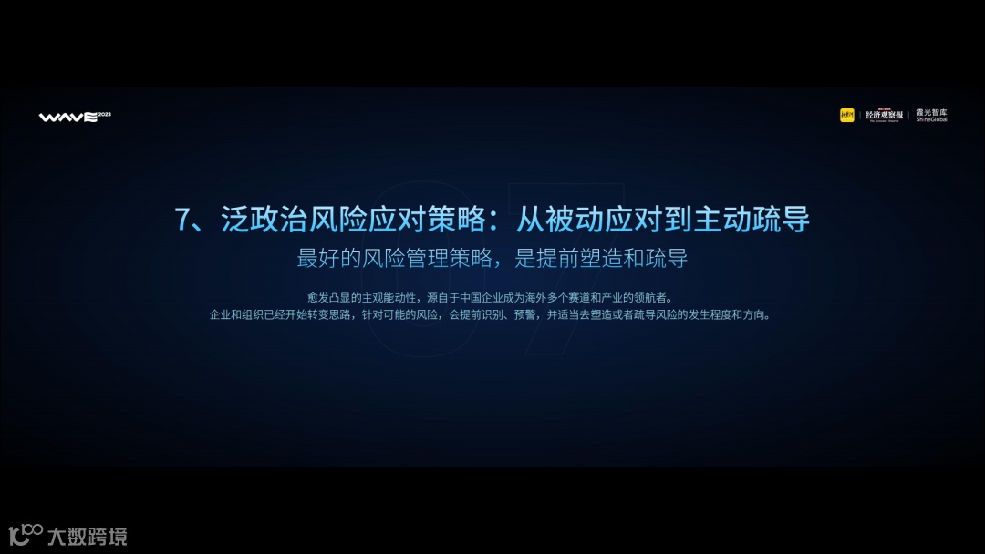 在强调企业在海外社会责任的同时,我们也要看到,在全球滞胀风险与地缘冲突加剧的宏观背景下,企业在海外面临的泛政治风险愈发频繁和复杂。对此,我们的第七个洞察,即为泛政治风险应对策略:从被动应对到主动疏导。