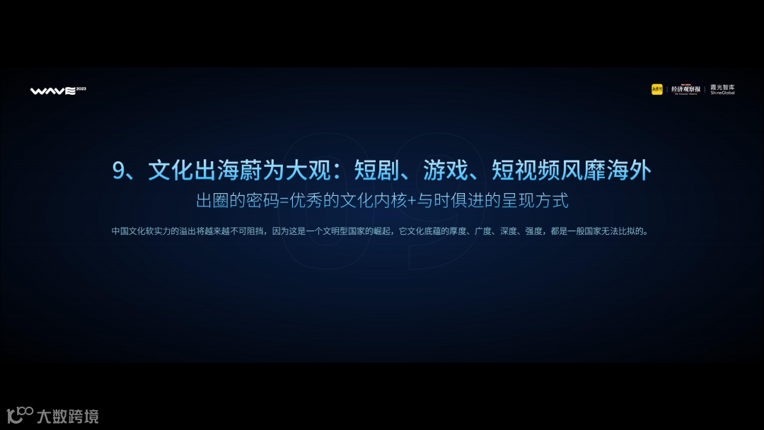随着中国品牌和中国商业模式驰骋海外,中国文化的全球影响力也随之增强。我们的第九条判断,就是以短剧、游戏、短视频为载体的中国文化出口会成为火热风口。