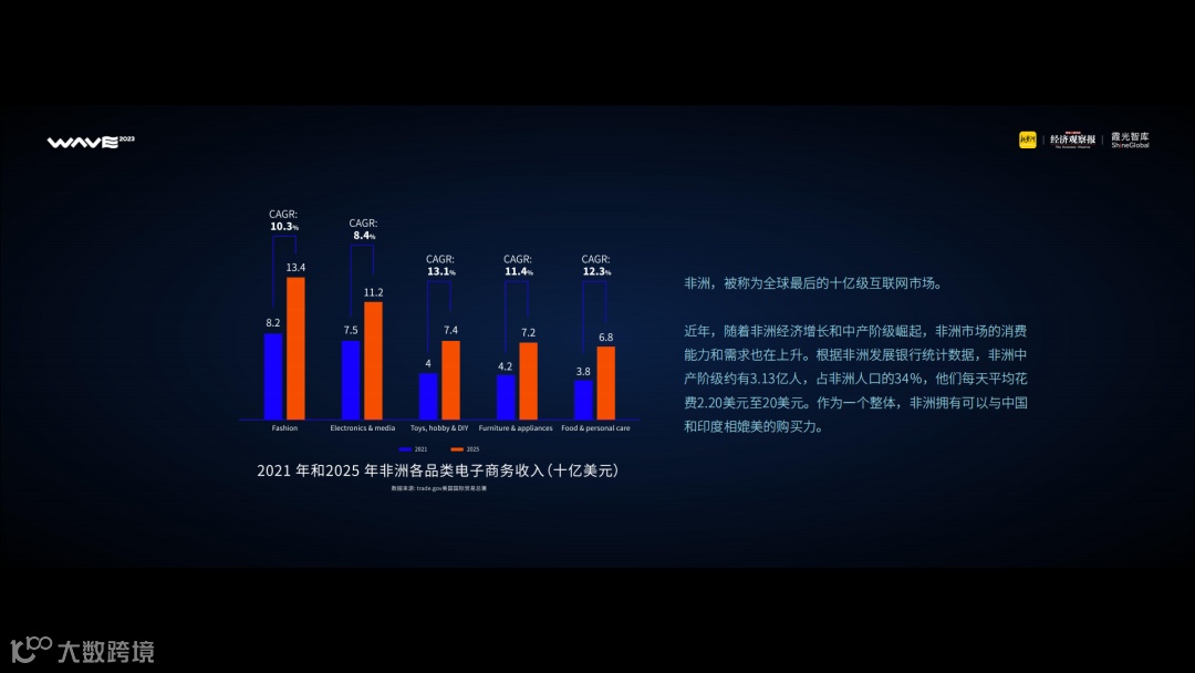 就像这张图片所展示的,时尚、电子、玩具品类分别占据非洲热销品类 TOP3 的位置且增势迅猛。非洲的消费升级,由此可见一斑。