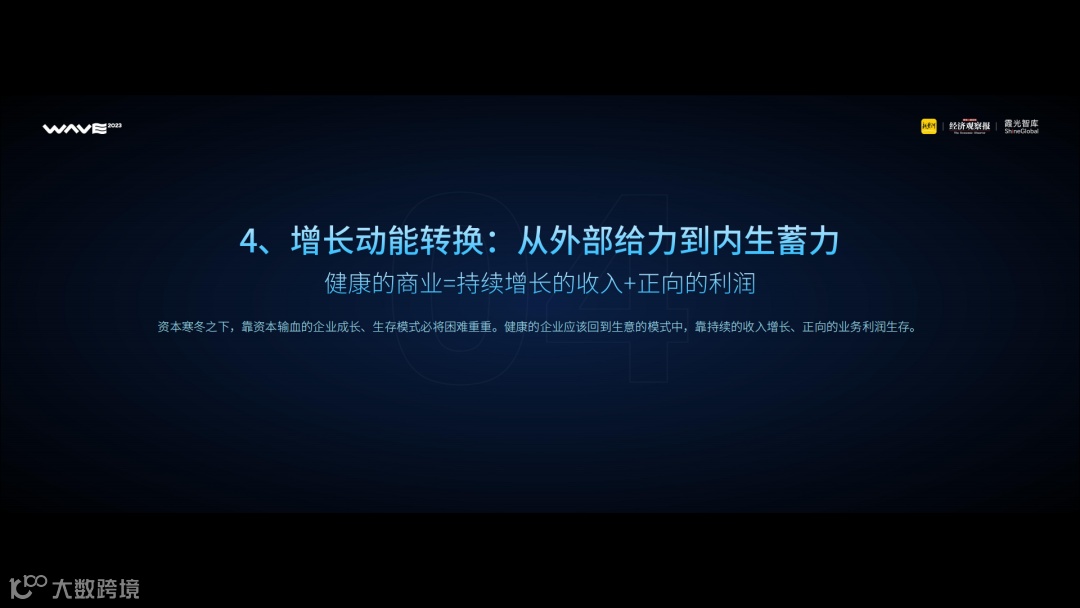 霞光智库的第四条研判,则是企业增长动能的转换:从外部给力到内生蓄力。资本寒冬之下,靠资本输血的企业成长、生存模式必将困难重重。健康的企业应该回到生意的模式中,靠持续的收入增长、正向的业务利润生存。