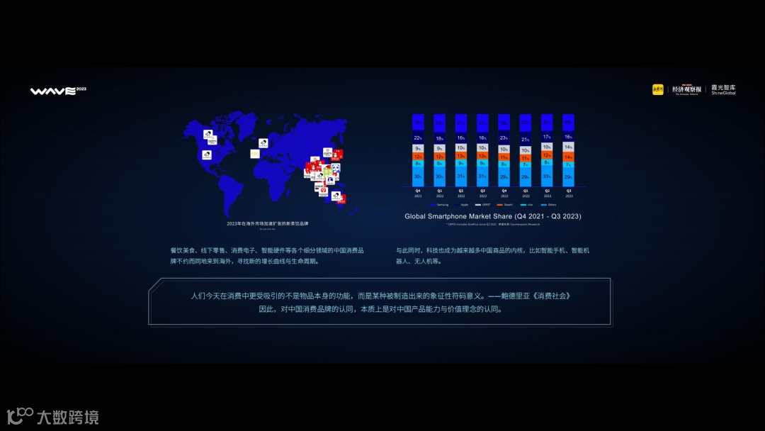 数据显示,2021年第四季度—2023年第三季度,全球智能手机出货量前五大手机品牌中,中国品牌占三席:OPPO、小米、vivo跻身其中。
