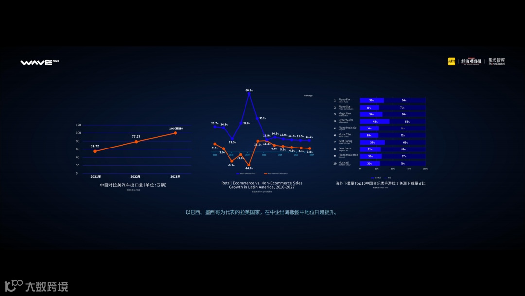 通过这三张图我们可以看到,中国对拉美汽车出口量逐年递增,2023年将有望突破100万辆。在电商领域,2023年拉美的电商销售额将同比增长14.3%,预计在2026年突破2000亿美元大关。而在数字文娱赛道,拉美成为中国音乐手游最大出海市场。其中位居榜首的中国音乐手游Piano Fire,36%的海外下载量来自拉美。