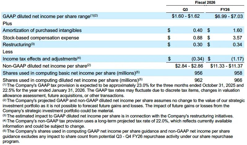注:Salesforce的收入指引包含GAAP与非GAAP财务指标。下表为2026财年第三季度及全年的详细指引摘要: